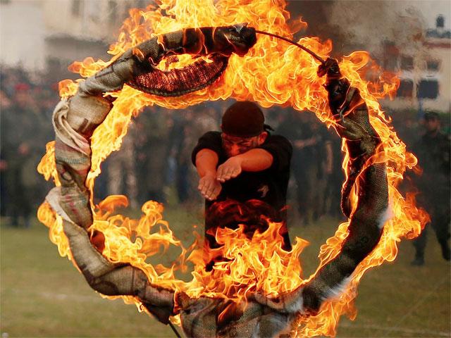 یک دانش اموز فلسطینی در حال پرش از حلقه اتش است , این اموزش ها پس از فارغ التحصیلی دانش اموزان و توسط نیرو های حماس انجام می شود هدف از این اموزش ها تربیت نیروهایی قوی برای ازاد سازی فلسطین اشغالی از دست نیرو های غاصب اسرائیلی هست