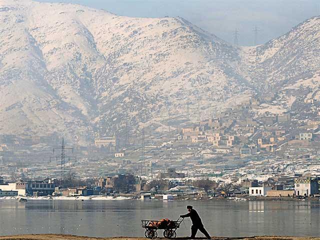 مرد دست فروش افغانی در حال عبور از دریاچه شهدای کابل هست …
