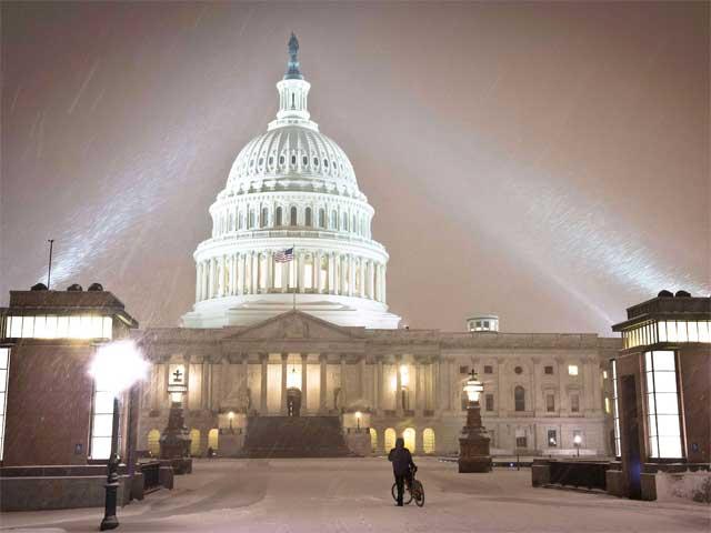 بارش سنگین برف و سرمای فوق العاده شدید در شرق ایالات متحده که در چند سال اخیر بی سابقه نشان می دهد و دوچرخه سواری که در حال تماشای ساختمان کنگره ایالات متحده است.