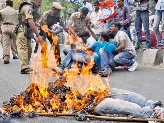 معترضان به دولت در حیدراباد ادمک ساختگی! را به نشانه اعتراض و خشم خود به اتش کشیده اند پلیس نیز درصدد دستگیری معترضین است