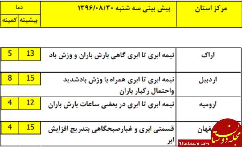بارش در روز سه شنبه در بخش هایی از غرب، جنوب غرب، دامنه های زاگرس جنوبی و مرکزی و در روز چهارشنبه دربخش هایی از غرب، جنوب غرب، دامنه های زاگرس مرکزی وجنوبی از شدت بیشتری برخوردار خواهد بود و در این مدت احتمال آب گرفتگی معابر عمومی در برخی مناطق ذکر شده دور از انتظار نخواهد بود.