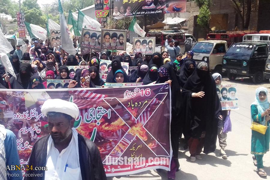 این تظاهرات با تلاش و همکاری سازمان دانشجویان اصغریه و سازمان دانشجویان امامیه در منطقه حیدرآباد پاکستان برگزار و پرچمهای آمریکا و رژیم صهیونیستی به آتش کشیده شد.