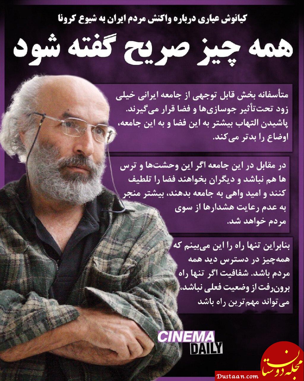 کیانوش عیاری درباره واکنش مردم ایران به شیوع کرونا به شرق گفت: متأسفانه بخش قابل توجهی از جامعه ایرانی خیلی زود تحتتأثیر جوسازیها و فضا قرار میگیرند. پاشیدن التهاب بیشتر …