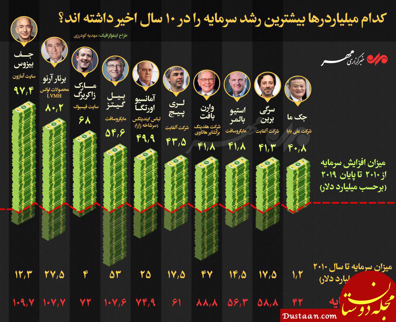 اینفوگرافی زیر میزان رشد سرمایه میلیاردرهای جهان را در ۱۰ سال اخیر نشان می دهد، بیشترین رشد متعلق به جف بیزوس نوسس سایت آمازون می باشد با ۹۷/۴ میلیارد دلار …
