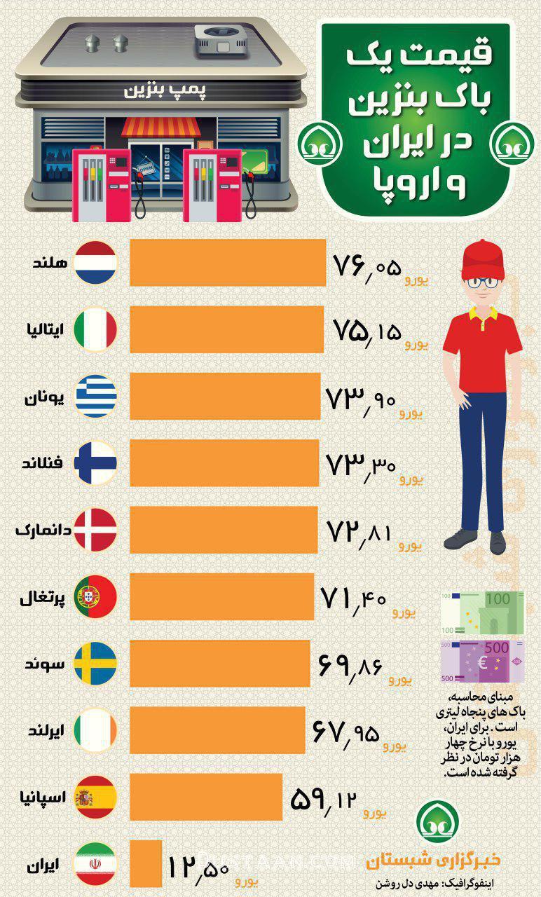 قیمت یک باک بنزین در ایران و اروپا؛ کشور های هلند و ایتالیا به ترتیب با ۷۶ و ۷۵ یورو ، گرانترین بنزین را در جهان عرضه می کنند.