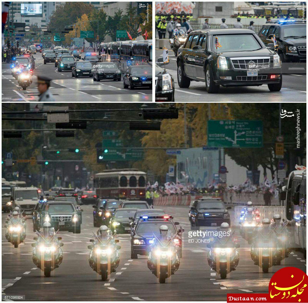 تصویری از اسکورت دونالد ترامپ رئیس جمهور ایالات متحده آمریکا در جریان سفر سیاسی اش به سئولرا مشاهده می کنید. اسکورت دونالد ترامپ در سئول