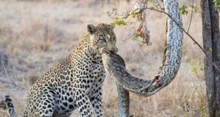 نمایی از شکار مار پیتون توسط پلنگ