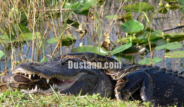تصویر زیر نمایی از درگیری مرگبار مار پیتون با تمساح گرسنه را نشان می دهد، در این نبرد تمساح مار غولل پیکر را زیر ارواره های قدرتمند خود له کرده …