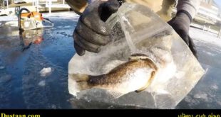 اردک ماهی در حالی که یک ماهی کوچکتر را به عنوان طعمه شکار کرده و در دهان دارد، به دلیل سرد شدن ناگهانی اب دریاچه یخ زده و شانس خوردن …